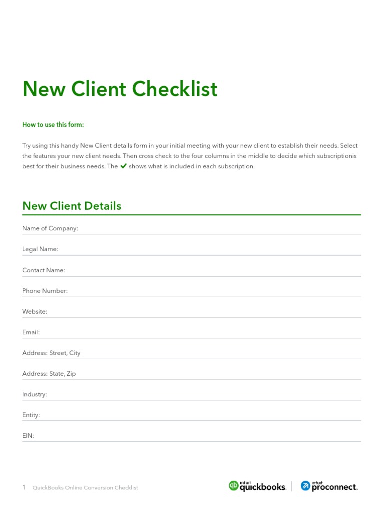 New Client Checklist Quickbooks - Quickbooks new client checklist* use this handy form in your initial new client meeting to establish their needs and identify which quickbooks. The quickbooks new client checklist is an indispensable tool for ensuring your financial operations are in order. New client checklist how to use: Try using this handy form in your initial meeting with your new client to establish their needs. Try using this handy form in your initial meeting with your new client to establish their requirements and help. Select the features your new client needs. Try using this handy new client details form in your initial meeting with your new client to establish. New client checklist how to use this form: