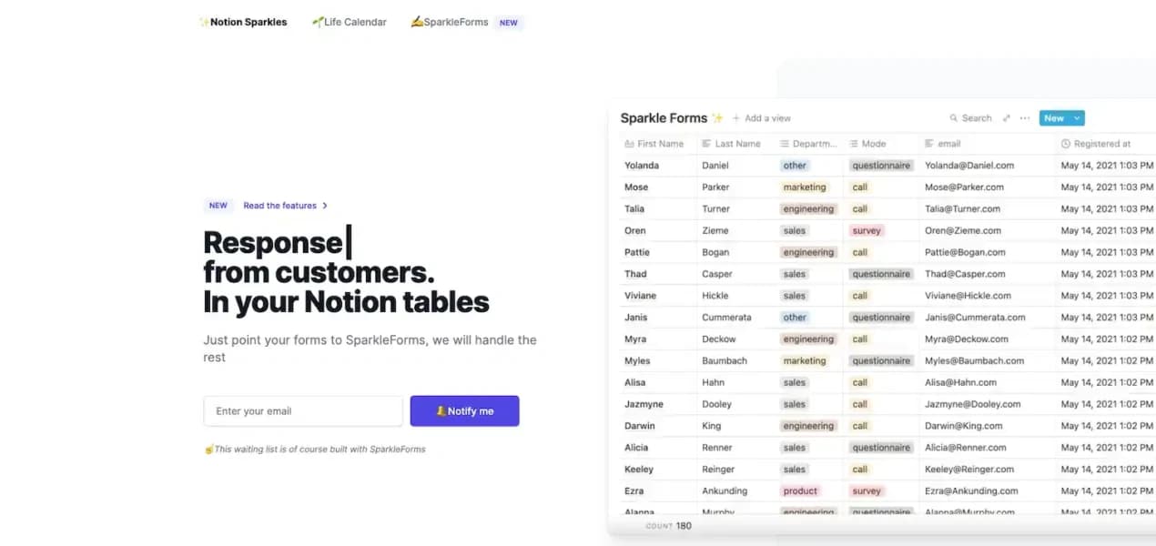 A bridge between your forms and your notion tables. Sparkleforms is a headless solution for form management. Notion sparkles offers a dazzling array of features to supercharge your notion forms experience. From sleek form designs to advanced. With a lot of sparkles along.