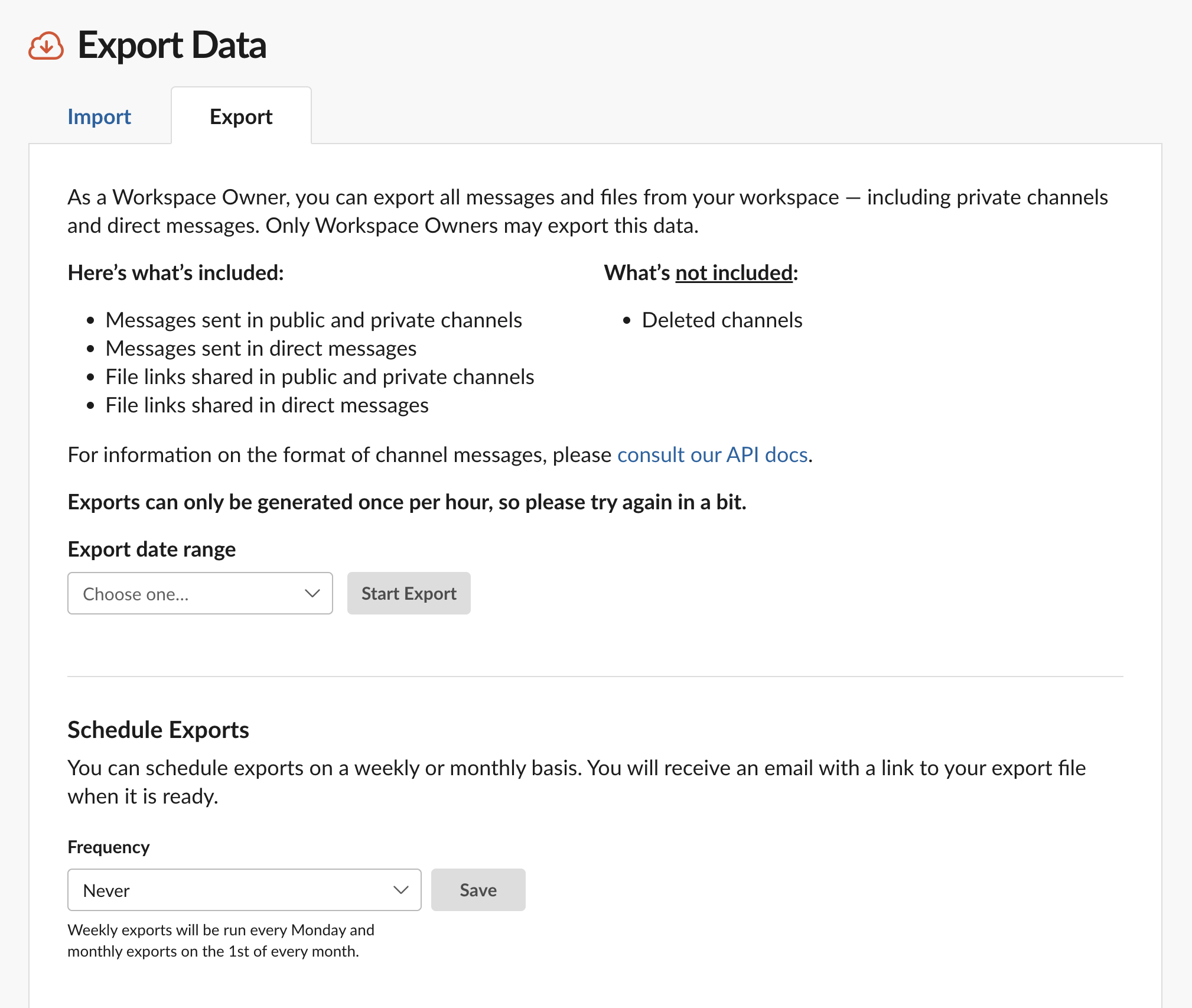 Depending on your plan, you may have a few. With slack, you can export data from your workspace or enterprise grid organization. Understand which slack plans allow you to export public and private channel data, with varying access depending on subscription. Learn how to export slack conversations and data for compliance, analysis or backup. Our guide demystifies the slack export.
